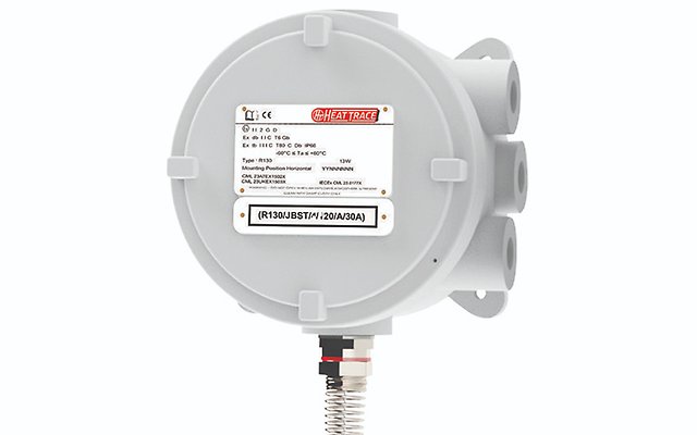 Chaque thermostat peut raccorder directement un câble d’alimentation et un câble chauffant, assurant ainsi la régulation locale du circuit. Intégrés dans un boîtier R130 (Ø130 mm) en aluminium moulé haute qualité peint RAL 7035, ils sont adaptés aussi bien aux environnements sûrs qu’aux zones dangereuses (Zone 1 et Zone 2, Gaz IIA/IIB/IIC).